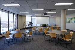 The Brinkman Seminar Room offers a professional, engaging space designed for presentations, trainings and seminars. Its tiered seating and fixed tables encourage collaboration and conversation, making it an ideal setting for meaningful connections and impactful events.